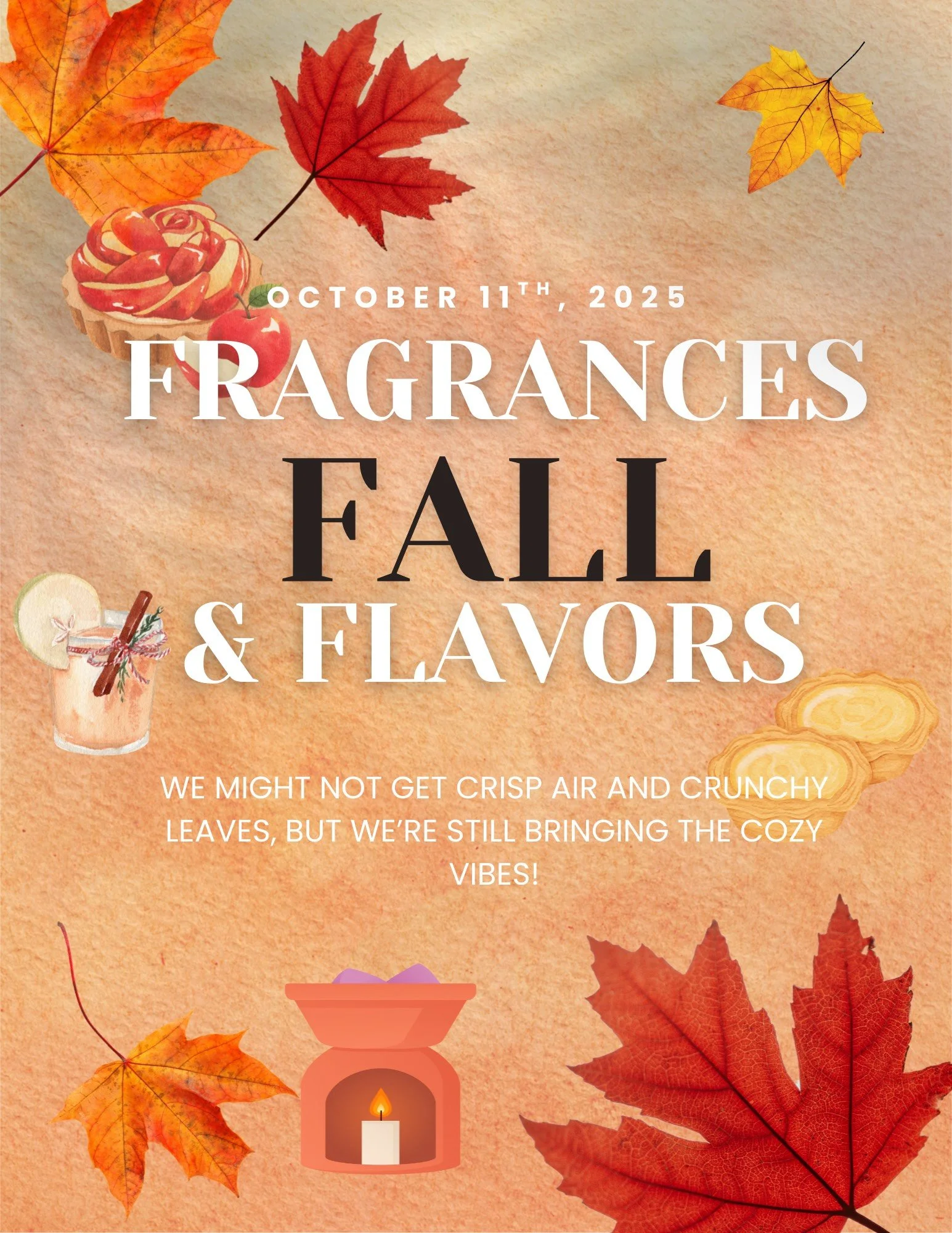 Guests will enjoy: 🕯 Hands-on wax melt making — craft your own fall-inspired creations with notes of caramel apple, pear, pumpkin, cinnamon, and more. 🍎 Seasonal sips & bites — spiced cider paired with a curated dessert flight by Edible Creations. 🎁 A set of your custom wax melts to take home — the perfect way to keep fall alive, even in Florida sunshine.