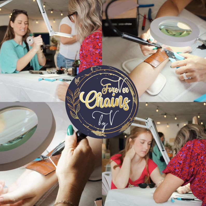 Join ForeverChainsByV and get zapped if you are unfamiliar with the process of ‘’permanent jewelry” it’s a fun experience where you are able to pick a chain of your choice and have a professional weld the chain of your choice to create a clasp-less necklace, bracelet, or anklet. The most common question is “does it hurt?!” … the answer is NO, the welding process does not touch your skin. You can also choose from a variety of charms to add to your chain!