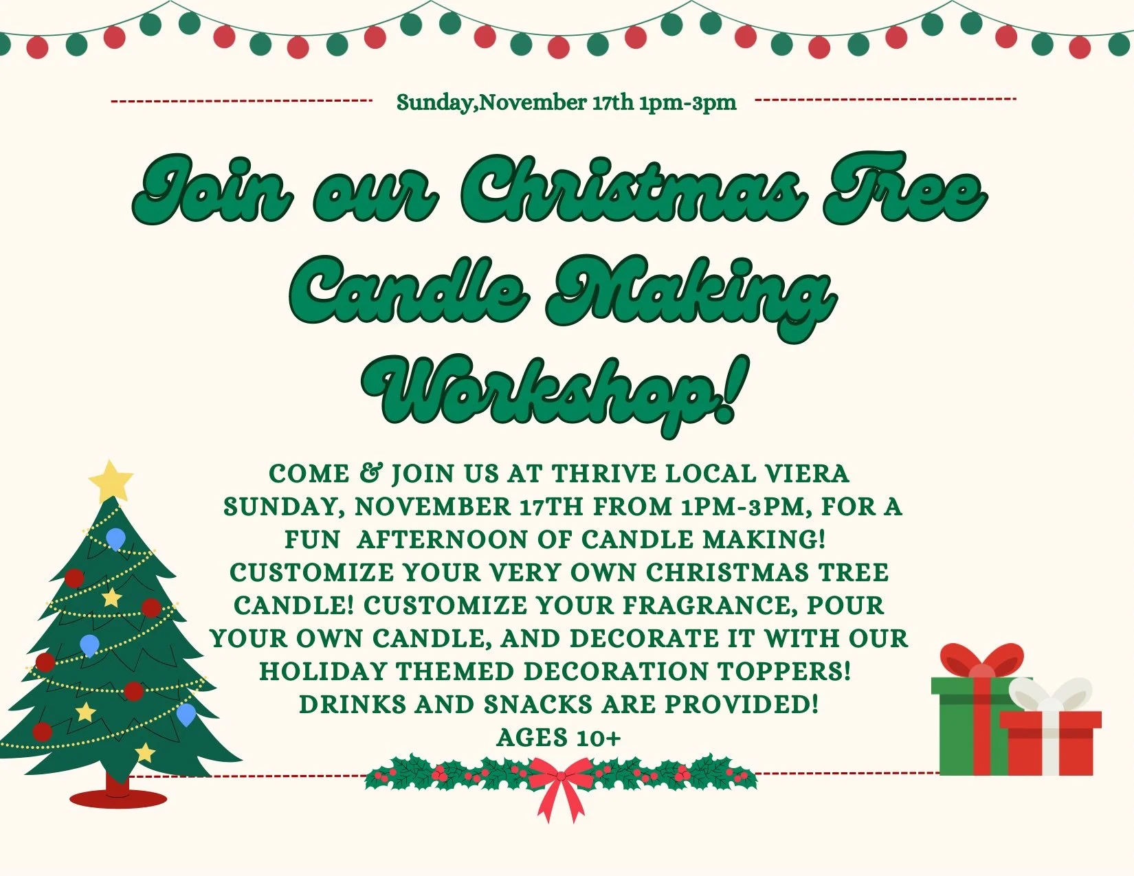 Come & join us at Thrive Local Viera Sunday, November 17th from 1pm-3pm, for a fun afternoon of candle making! Customize your very own Christmas tree candle! Customize your fragrance, pour your own candle, and decorate it with our holiday themed decoration toppers!