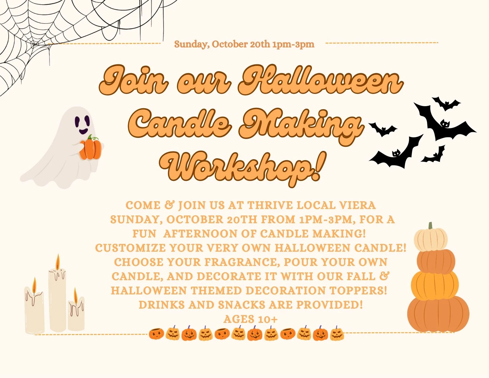 Come & join us at Thrive Local Viera Sunday, October 20th from 1pm-3pm, for a fun afternoon of candle making! Customize your very own Ghost candle! Customize your fragrance, pour your own candle, and decorate it with our Halloween themed decoration toppers!